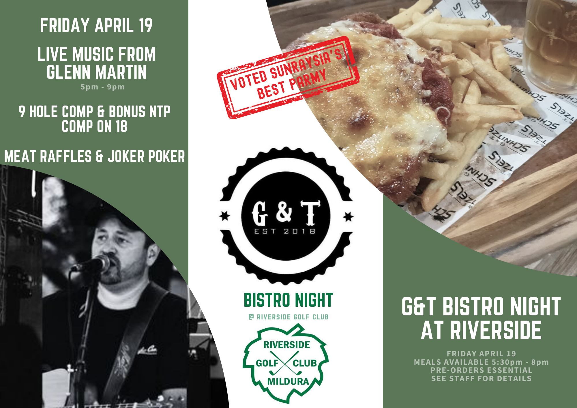 Meals available 5:30pm to 8:00pm. Pre-Orders essential. Contact us on (03) 5023 4255. Live music from Glenn Martin from 5:00pm to 9:00pm. 9 Hole comp & bonus NTP on the 18th. Meat raffles & Joker Poker. Details.